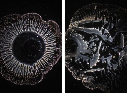 Das Bild zeigt rechts ungespiegeltes Leitungswasser und links gespiegeltes nach nur 2 Minuten im Dunkelfeldmikroskop.